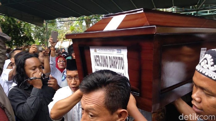 Raut wajah sedih pun terpancar dari muka para pelayat, khususnya keluarga Herjuno yang kehilangan salah satu anggota keluarganya. Bahkan, ibu dari Herjuno yakni Nasiah tampak menangis sembari menyusul masuk ke dalam rumah duka. Tak lama setelah dimasukkan ke rumah duka, para pelayat mensalatkan jenazah Herjuno.