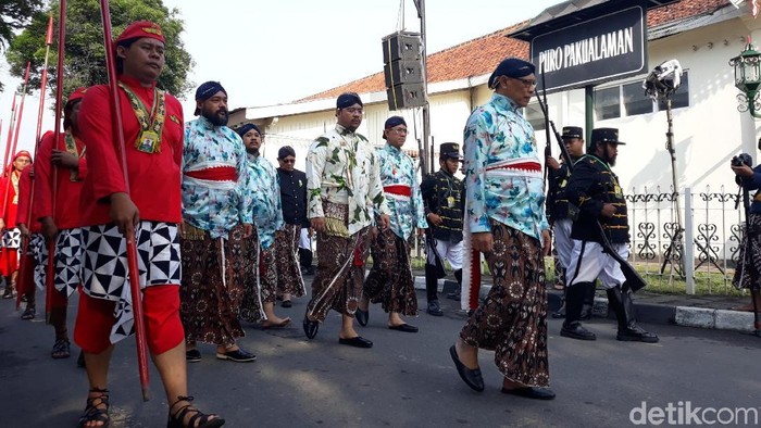 Tampak pula prajurit bregada dengan mengenakan seragam berwarna merah dan hitam berdiri di sepanjang jalan dari Masjid Gede Pakulaman hingga gerbang Puro Pakualaman.