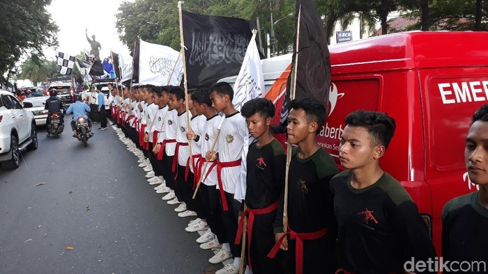Aksi digelar di bundaran Gladag, Jalan Slamet Riyadi, Solo, Sabtu (16/3/2019). Peserta aksi terlihat berderet ke barat dengan membawa bendera tauhid. Terdengar beberapa orang bergantian menyampaikan orasi berisi kutukan terhadap pelaku teror.