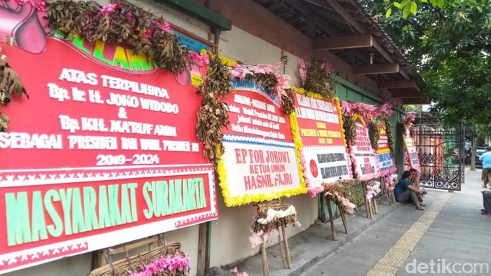 Pantauan detikcom, Rabu (1/5/2019) sore, puluhan karangan bunga berjajar rapi di Jalan Letjen Suprapto, Kelurahan Sumber, Banjarsari, Solo. Karangan bunga ditata di sekitar gang rumah Jokowi dan gedung keluarga Jokowi, Graha Saba Buana.