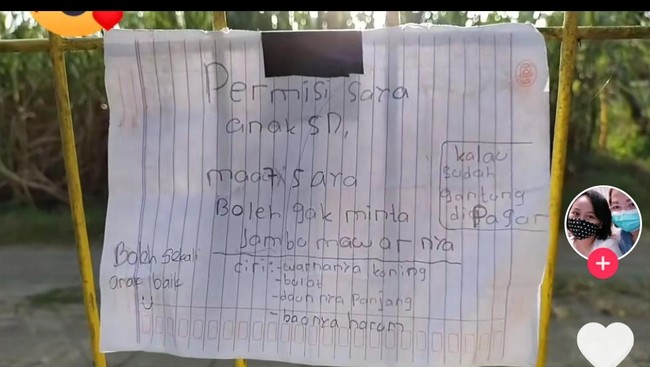 Video seorang bocah SD ketika meminta buah jambu viral di TikTok. Bocah itu minta izin melalui sepucuk surat yang ditempel di pagar rumah pemilik pohon jambu itu.