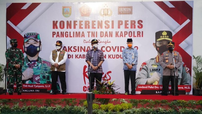 Gubernur Jawa Tengah Ganjar Pranowo tampak mendampingi kedatangan rombongan tersebut. Sebelum tiba di Kudus, rombongan Panglima TNI dan Kapolri sempat meninjau vaksinasi di Bandung, Jawa Barat, Kamis (17/6).