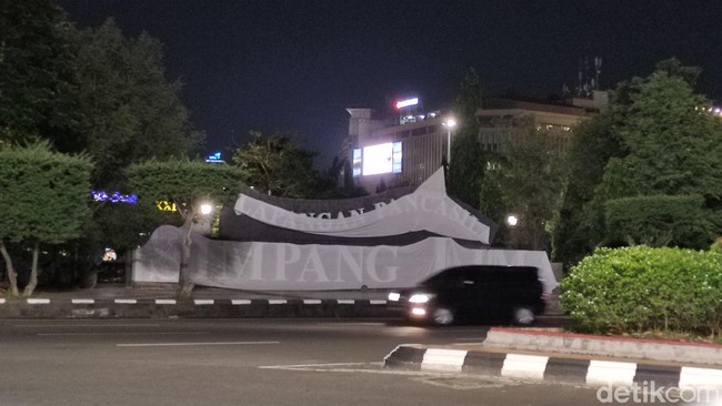Taman yang menjadi ikon Kota Semarang itu tampak sepi malam ini. Padahal biasanya banyak sepeda atau odong-odong hias yang mondar-mandir dengan lampunya. Landmark berupa tulisan Simpang Lima pun ditutup kain putih.