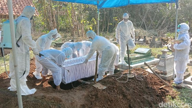"Tadi dibawa ke rumah sakit dulu untuk disucikan oleh petugas, ini sekarang dimakamkan oleh petugas ber-APD lengkap," kata istri almarhum, Wuri saat ditemui detikcom di permakaman.