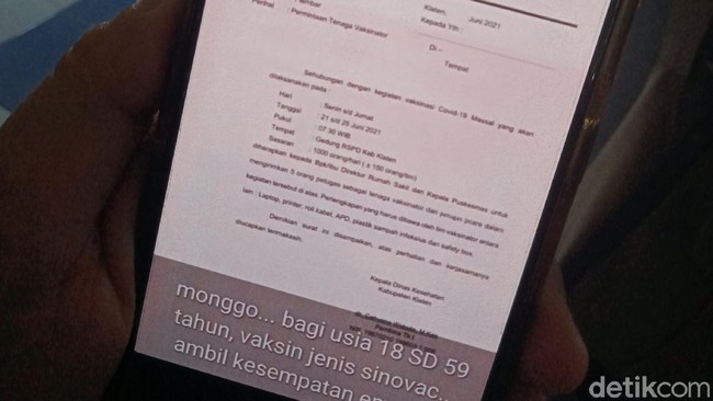 Dilihat detikcom, postingan undangan itu memperlihatkan surat mirip undangan kegiatan vaksinasi di Radio Siaran Pemerintah Daerah (RSPD) Klaten namun belum ditandatangani. Di bawah foto tersebut ada tambahan kalimat di bawahnya berbunyi, 'Monggo bagi warga berusia 18 SD 59, vaksin jenis sinovac, ambil kesempatan emas ini,' tulis postingan tersebut.