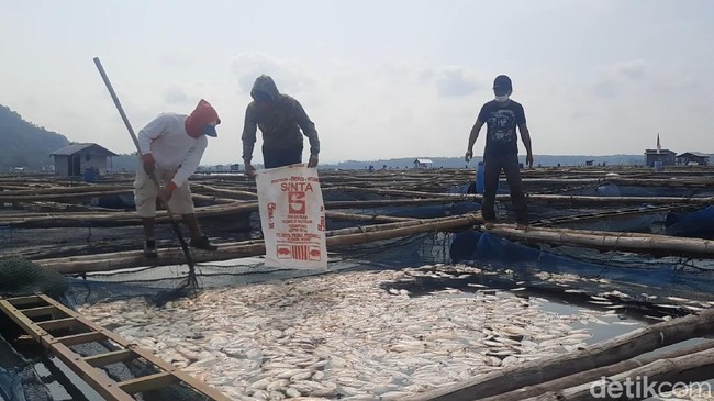 "Benar, kematian ikan terjadi tiga hari terakhir. Jadi untuk kelompok saya itu, rata-rata sehari mati sekitar lima kuintal ikan," ujar Ketua Kelompok Budidaya Ikan 'Nila Kencana', Sugiyanto, saat ditemui wartawan di lokasi, Rabu (23/6/2021).