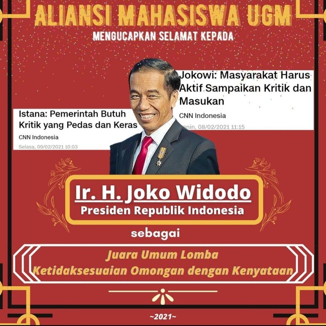 Setelah BEM Universitas Indonesia (UI) menyebut Presiden Joko Widodo (Jokowi) sebagai 'The King of Lip Service' kini giliran Aliansi Mahasiswa Universitas Gadjah Mada (UGM) yang memberikan gelar. Aliansi Mahasiswa UGM memberikan Jokowi ucapan selamat sebagai juara umum lomba 'Ketidaksesuaian Omongan dengan Kenyataan'.