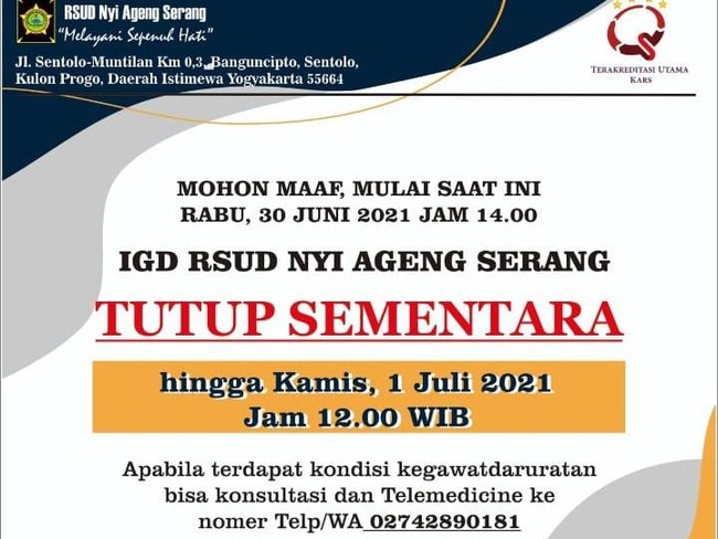 Layanan Instalasi Gawat Darurat (IGD) di RSUD Nyi Ageng Serang (NAS) di Sentolo, Kabupaten Kulon Progo, Daerah Istimewa Yogyakarta (DIY), kembali dibuka hari ini. Salah satu rumah sakit rujukan COVID-19 di Kulon Progo ini sebelumnya ditutup lantaran kekurangan persediaan oksigen bagi pasien khususnya yang terkonfirmasi positif Corona.