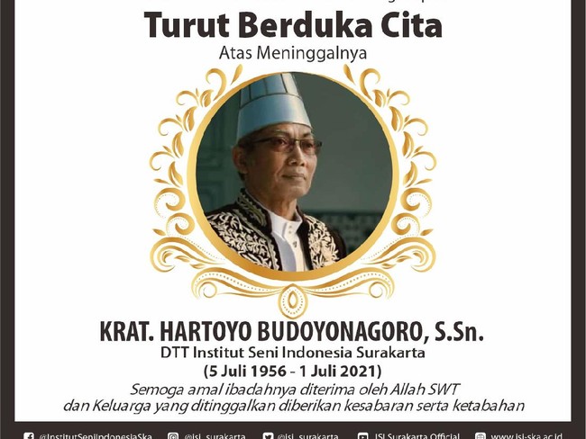 Dosen Institut Seni Indonesia (ISI) Solo, KRAT Hartoyo Budoyonagoro, meninggal dunia dengan kondisi terkonfirmasi positif virus Corona atau COVID-19, hari ini. Dosen yang sudah mengajar sejak tahun 1970 itu statusnya diperbantukan untuk mengajar di Prodi Batik, setelah pensiun dari dosen rias dan busana Fakultas Seni Pertunjukan serta Fakultas Seni Rupa dan Desain.