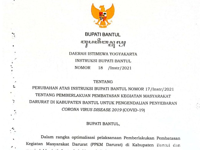 Aturan tersebut tertuang dalam Instruksi Bupati Bantul (Inbub) No.18/instr/ 2021 tentang perubahan terhadap Inbub No.17/instr/2021 tentang PPKM Darurat di Kabupaten Bantul. Inbup itu diteken langsung oleh Bupati Bantul, Abdul Halim Muslih kemarin, Senin (5/6).