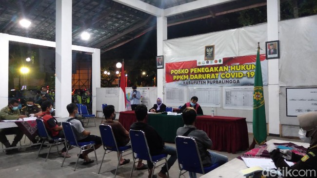 Para pelanggar PPKM Darurat di gelar di Purbalingga, Jateng, disidang. Sidang tidak dilakukan di gedung PN namun di Posko Satgas COVID-19 setempat. Hakim dari PN Purbalingga menjatuhkan vonis beragam terhadap mereka.