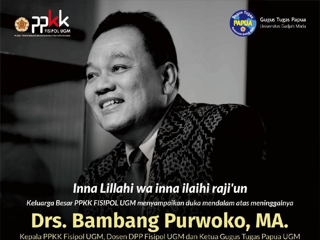 Dosen Universitas Gadjah Mada (UGM) Bambang Purwoko meninggal dunia positif Corona atau COVID-19. Bambang merupakan dosen UGM yang juga sempat bergabung dalam Tim Gabungan Pencari Fakta (TGPF) Intan Jaya.