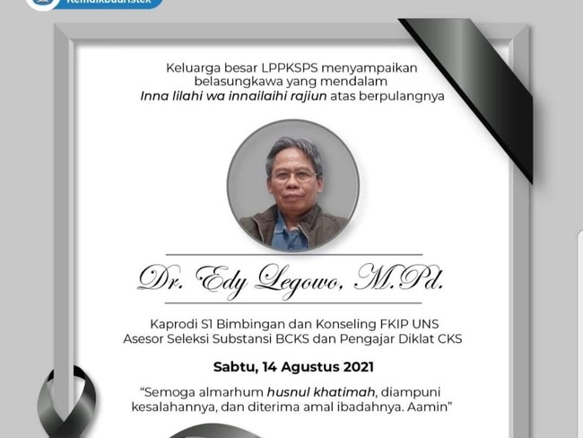 Universitas Sebelas Maret (UNS) Solo kembali berduka. Salah satu dosennya, Edy Legowo, terpapar virus Corona atau COVID-19 dan wafat pada Sabtu (14/8) sekitar pukul 23.00 WIB.