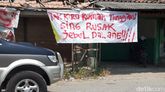 Kemudian di gapura jalan juga tergantung sejumlah poster. Antara lain bertuliskan, "Jonja-janji, ndandanine kapan?" (Janji-janji, perbaikannya kapan), "Pajak jalan terus, jalan rusak tak terurus". "Sido didandani ora? Nek ora sido meh tak tinggal isah-isah" (Jadi diperbaiki tidak? Jika tidak saya tinggal cuci piring).