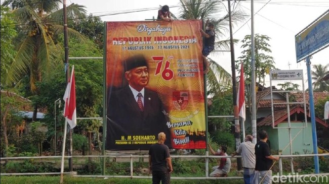 Baliho Pak Harto itu berwarna kuning merah dan hitam. Di baliho itu, tertulis, 'Dirgahayu Republik Indonesia ke-76'. Di bawahnya juga disematkan kalimat 'Indonesia Tangguh, Indonesia Tumbuh' dengan latar belakang lambang Garuda Pancasila.