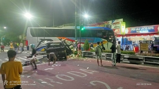 "Di saat bersamaan bus Sugeng Rahayu melaju dari arah barat dan menerobos rambu traffic light. Karena jarak yang terlalu dekat, terjadilah laka lantas," ujar Kanit Laka Satlantas Polres Sragen, Ipda Irwan Marvianto saat dihubungi detikcom, Minggu (22/8/2021).