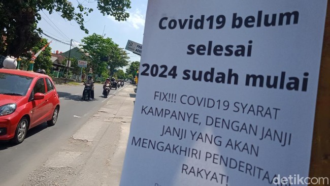 Ada yang bertuliskan, '17 Agustus tahun ini temanya bertahan hidup, dipaksa sehat di negara sakit, PPKM sampai mampus'. Ada juga bertuliskan, 'COVID Belum selesai 2024 sudah mulai, fixxx ! COVID-19 syarat kampanye yang akan mengakhiri penderitaan rakyat'.