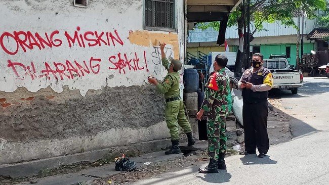 Pantauan detikcom, Selasa (24/8), tulisan-tulisan tersebut di antaranya berbunyi, '2021 Perang Tanpa Musuh' yang ditulis menggunakan cat semprot warna biru dan 'Pray For PKL, Indonesiaku Lagi Sakit'. Ada juga corat-coret 'Orang Miskin Dilarang Sakit #RIP Pemerintah' di bidang tembok toko yang terletak di pojok perempatan di Jalan Sutan Syahrir kawasan Pasar Legi.