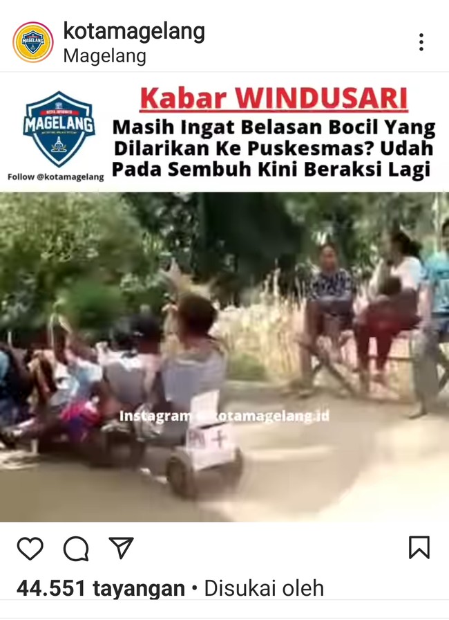 Video viral itu salah satunya diunggah akun Instagram @kotamagelang tiga hari lalu. Dalam video itu disebutkan jika sebelumnya sejumlah anak juga sempat jatuh hingga dilarikan ke puskesmas. Hingga hari ini pukul 13.45 WIB, video itu sudah ditonton lebih dari 44.560 netizen, dan disukai 5.225 orang.