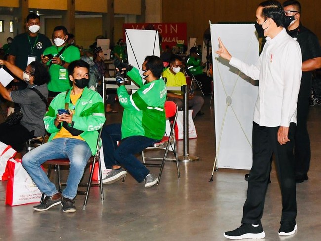 Presiden Jokowi meninjau pelaksanaan vaksinasi untuk driver online di Jogja Expo Center (JEC), Bantul, DIY. Dalam kunjungan itu Jokowi menyampaikan harapan akhir tahun ini lebih 70 persen rakyat Indonesia sudah divaksin.