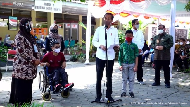"Hari ini saya meninjau pelaksanaan vaksinasi untuk kurang lebih 375 pelajar SLB yang kita harapkan bisa memberikan perlindungan, memberikan proteksi secara maksimal kepada para pelajar SLB," ucapnya saat junpa pers yang disiarkan YouTube Sekretariat Presiden, Jumat (10/9/2021).