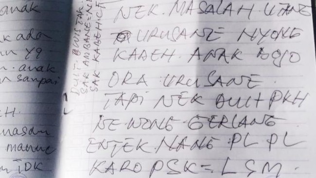 Pesan itu ditulis pada dua lembar halaman buku tulis dengan menggunakan Bahasa Jawa sebagai berikut: