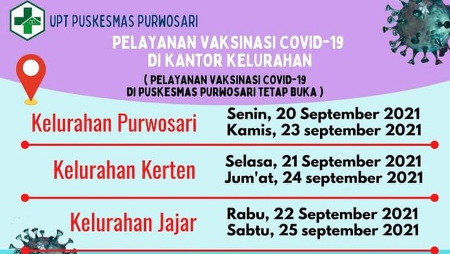 "Misalnya di Keraton Kasunanan Surakarta juga ada vaksinasi 20 September-6 Oktober. Kemudian di Kelurahan Purwosari dari Senin (20/9) dan Kamis (23/9)," kata Ina, sapaannya.