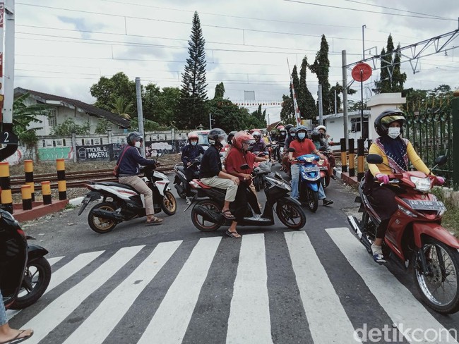 Pantauan detikcom Selasa (5/10/2021) pukul 09.30 WIB, para pengendara itu datang dari arah selatan atau simpang empat jalan lingkar selatan. Saat palang kereta sisi selatan menutup mereka berjajar menuju arah utara.