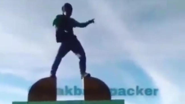 Video berdurasi sekitar 30 detik itu terlihat seorang pria berdiri dengan kaki menapak pada dua tiang tugu. Dengan diiringi musik, pria itu pun terlihat asyik berjoget.