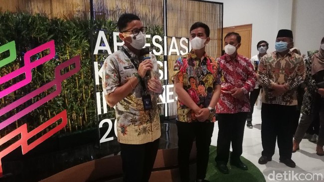 Menteri Pariwisata dan Ekonomi Kreatif (Menparekraf) Sandiaga Uno didampingi Wali Kota Solo Gibran Rakabuming Raka meninjau Apresiasi Kreasi Indonesia di De Tjolomadu, Karanganyar, Jawa Tengah. Saat ditanya soal kans Gibran maju Pilgub DKI Jakarta, seperti apa jawaban Sandiaga Uno?