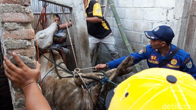 Sapi itu pun masuk ke sumur yang ukurannya cukup sempit. Sapi tidak sampai jatuh ke dasar sumur. Tetapi tersangkut mesin pompa air di tengah-tengah sumur.