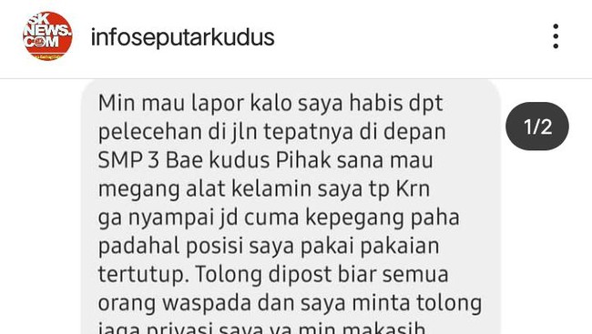 "Min mau lapor saya habis dpt pelecehan di jln tepatnya di depan SMP 3 Bae Kudus. Pihak sana mau megang alat kelamin saya tp Krn ga nyampai jd kepegang paha padahal posisi saya pakai pakaian tertutup. Tolong dipost biar semua orang waspada dan saya minta tolong jaga privasi saya min makasih," tulis pesan dugaan pelecehan seksual di media sosial infoseputarkudus yang dilihat detikcom, Selasa (9/11/2021).
