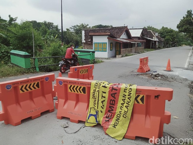 Pantauan detikcom, jalan lingkar barat ditutup dengan pembatas water barrier mulai simpang empat terminal Delanggu. Sedang di lokasi jembatan setengah badannya ditutup serupa.