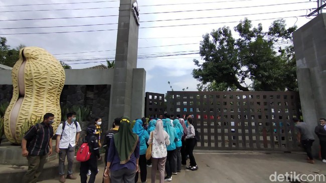 Beberapa karyawan tampak berbaris di bagian luar pagar pabrik. Sementara yang lain ada tampak duduk-duduk di atas sepeda motor yang diparkir sisi kanan dan kiri bagian depan pabrik.