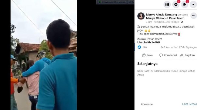 "Se pandai"nya tupai melompat pasti akan jatuh juga. Tibo apes dirimu mbk,,Swokorrrr!! #Lokasi_Pasar_Jasem," tulis penggungah video, Marsya Alluvia Rembang, seperti dikutip detikcom, Rabu (24/11/2021).