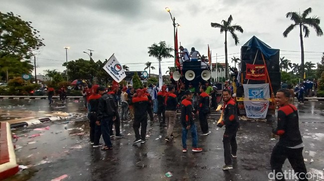 Meski kondisi hujan deras, buruh sempat menunggu di depan kantor bupati. Mereka pun memutar musik dengan suara keras sambil menunggu hingga ada persetujuan dari orang nomor satu di Kota Ukir itu.