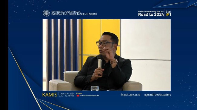 "Kita bicara realita ya, jadi posisi saya itu ada dua pilihan ibaratnya dua pintu lah. Pintu pertama melanjutkan periode kedua karena saya kan gubernur baru periode satu. Kalau saya pilih pintu yang kiri ya saya 2024 ikut Pilgub lagi untuk 5 tahun berikut," kata Ridwan Kamil saat menjadi pembicara dalam diskusi Fisipol Leadership Forum: Road to 2024 yang diadakan Fisipol UGM, Yogyakarta, Kamis (2/12/2021).