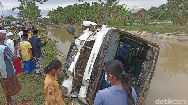 "Usai suara ban meletus kemudian terdengar suara rentetan seperti tabrakan. Benar ternyata bus rombongan pengantin bannya meletus ban dan menabrak dua warung hingga akhirnya tercebur ke sungai," jelas Kosim.
