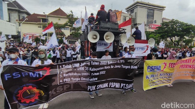 Massa buruh kembali demo menuntut Gubernur Jawa Tengah Ganjar Pranowo merevisi keputusan soal upah minimum kabupaten/kota (UMK) tahun 2022. Jika tidak, massa mengancam akan membawa ke ranah hukum.