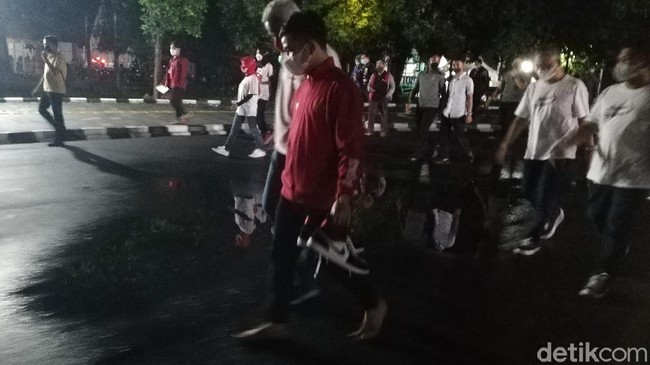 Gibran yang mengenakan jaket Timnas Indonesia tanpa canggung nyeker dan menenteng sepatu warna dominasi merah itu.
