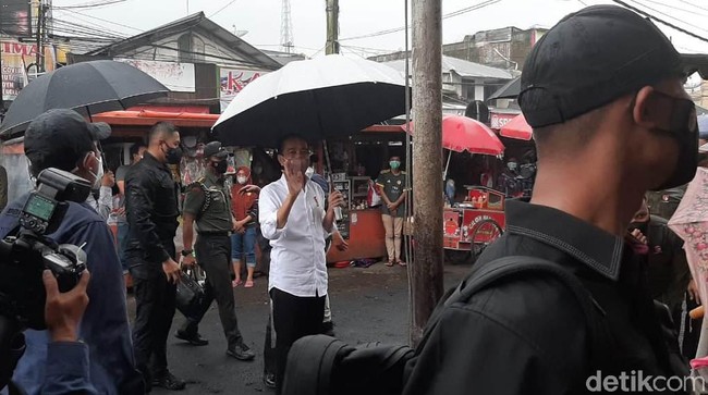 Pantauan detikcom, Jokowi beserta rombongan tiba di pasar Kertek pukul 14.25 WIB saat hujan lebat. Dengan memakai payung, Jokowi menyapa beberapa PKL yang berjualan di sekitar Pasar Kertek.