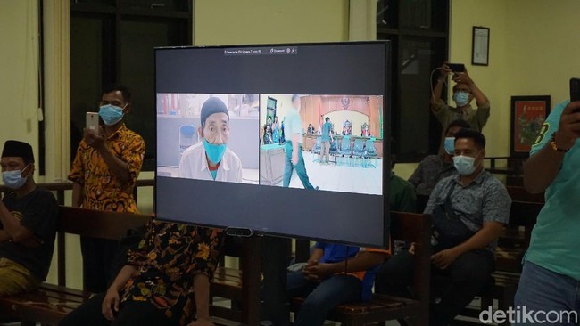 Mbah Minto sempat terdiam sebelum menjawab pertanyaan ketua majelis hakim. Dari layar virtual terdengar Mbah Minto dituntun untuk menyebutkan hasil putusan hakim terhadapnya.
