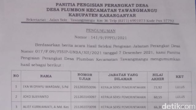 Surat terbuka peserta seleksi perangkat Desa Plumbon, peraih nilai tertinggi kalah dari anak kades viral di media sosial. Kepada Inspektorat Pemkab Karanganyar, Kades Plumbon Suwaji membenarkan telah memilik anak menantunya dengan alasan berpengalaman.