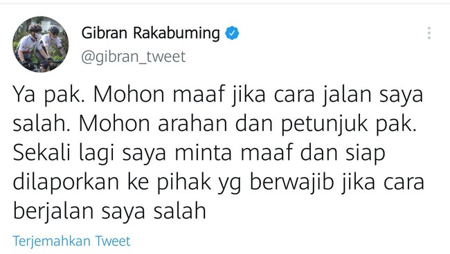 "Ya pak. Mohon maaf jika cara jalan saya salah. Mohon arahan dan petunjuk pak. Sekali lagi saya minta maaf dan siap dilaporkan ke pihak yang berwajib jika cara jalan saya salah," tulis Gibran di akun Twitter miliknya, @gibran_tweet.