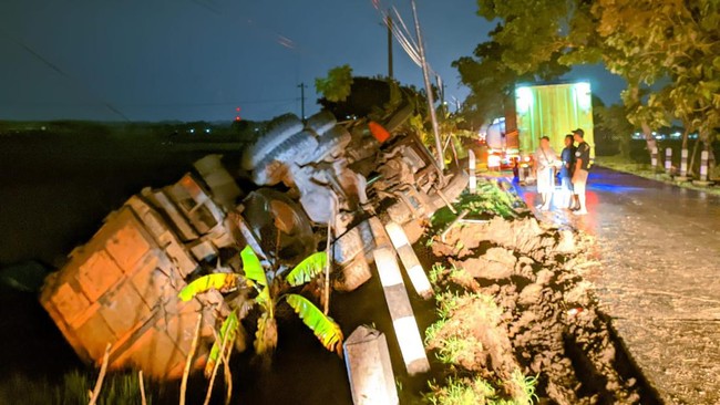 Roda kiri truk tronton lalu anjlok ke sisi jalan hingga membuat truk tersebut oleng. Truk tronton sempat menghantam pancang pembatas jalan, sebelum akhirnya terguling ke area persawahan sedalam sekitar dua meter.
