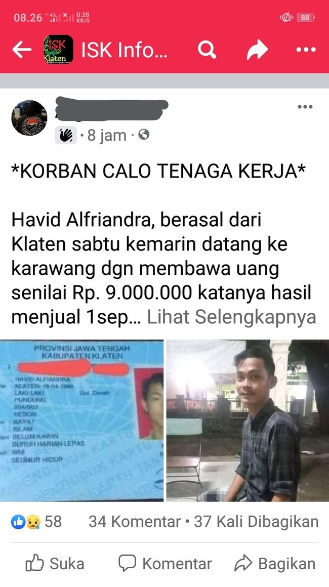 "KORBAN CALO TENAGA KERJA - Havid Alfriandra, berasal dari Klaten sabtu kemarin datang ke karawang dgn membawa uang senilai Rp. 9.000.000 katanya hasil menjual 1sepeda motor dan kayu, untuk bekerja di KIM dari info grup FB loker Karawang Cikarang dgn adm sejumlah Rp. 8.000.000,- ke sebuah yayasan yg baru dibuka jumat kemarin dan sekarang sudah tutup lagi. ironisnya, sisa uang 1.000.000, di pinta kembali Rp. 900.000,- sebagai biaya pendaftaran dan HP dia juga di ambil dgn alasan untuk memasukan Wifi. setelah itu para calo membubarkan diri kami temukan dia ketika sedang berjalan menuju arah kosambi dlm keadaan lapar dan haus, katanya dia mencari yg mengambil uang dan HP menggunakan ojeg kesana-kemari hingga kehabisan ongkos yg sisa 100rb. termasuk mencari saudarinya yg bernama DIAH karyawati Changsin asal PAKIS JAYA, mengingat tidak hapal NO HP, bahkan akses ke FBnya pun lupa password. barangkali ada warga KLATEN atau yg kenal dgm Diah Changsin asal PAKIS, mohon bantuannya, korban saat ini berada di Masjid Jamie Al-Barkah Kawali, Pancawati Klari dlm kedaan sehat tapi msh shock. catatan; anak Yatim," tulis akun Algixxxxxxx, Selasa (4/1/2021).