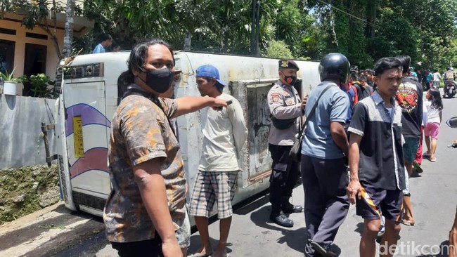 Akibatnya, mikrobus itu merosot mundur hingga oleng dan membentur tiang telepon, pohon dan bangunan rumah. Kendaraan itu baru bisa berhenti setelah terguling.