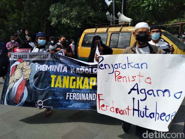Spanduk lainnya bertuliskan 'Meminta Kapolri Segera Tangkap dan Menahan Ferdinand Hutahaean'. Sedangkan poster-poster kecil antara lain bertuliskan 'Adili Ferdinand Hutahaean' dan 'Tahan Ferdinand Hutahaean'.