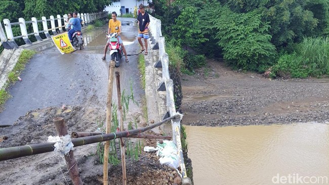 "Jembatan putus dikarenakan konstruksi jembatan tidak kuat menahan luapan air sungai. Bagian tebing terkikis, dinding penyangga tidak kuat menahan badan jembatan dan putus. Sementara tidak bisa dilewati oleh kendaraan dan ditutup," terangnya.