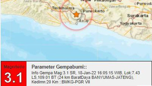 Gempa berkekuatan magnitudo 3,1 terjadi di Banyumas, Jawa Tengah. Gempa ini berpusat di darat.